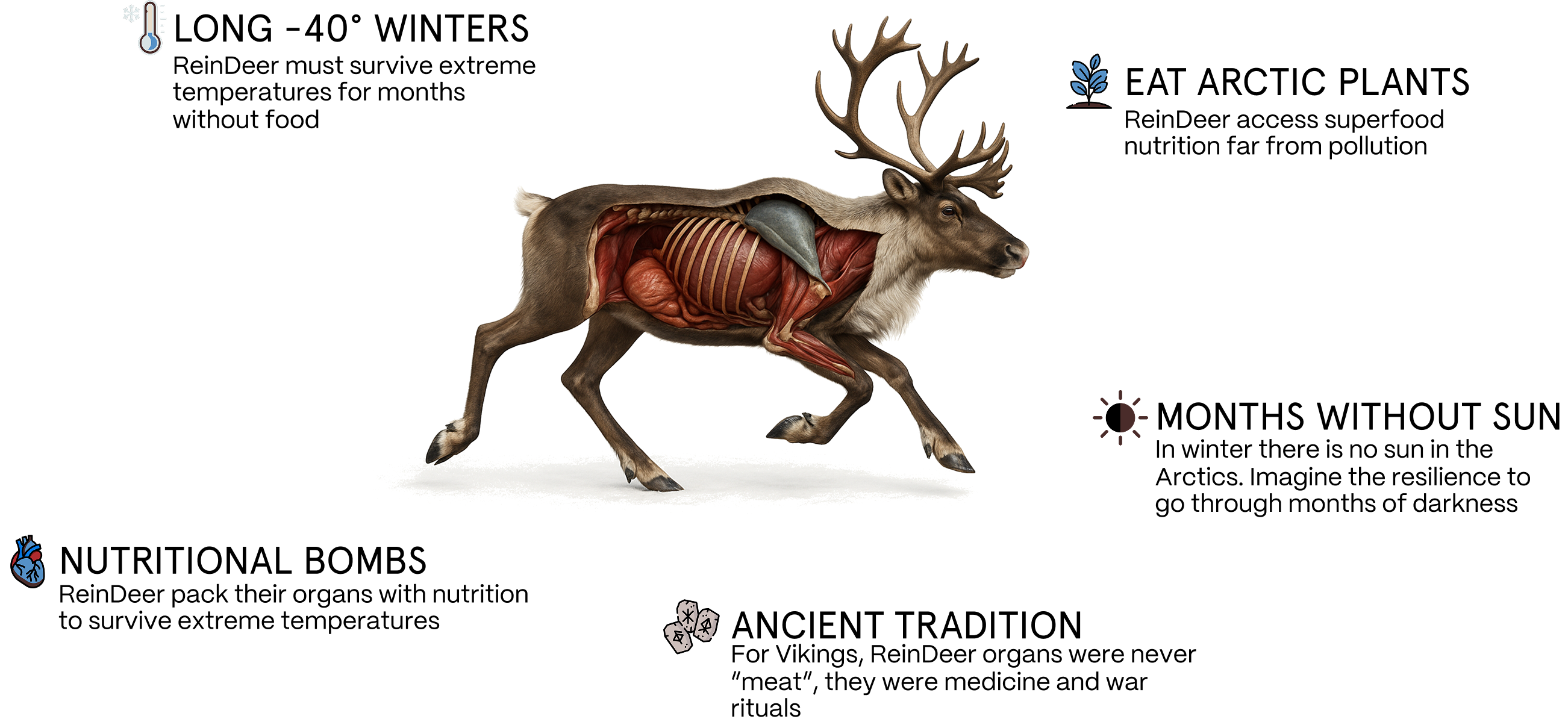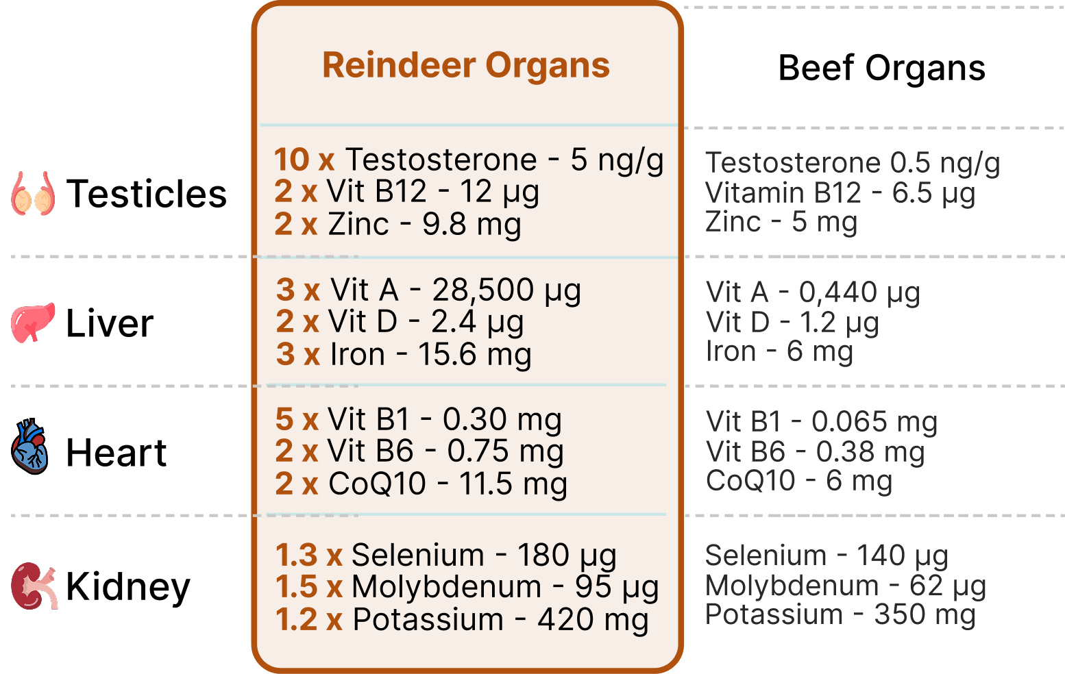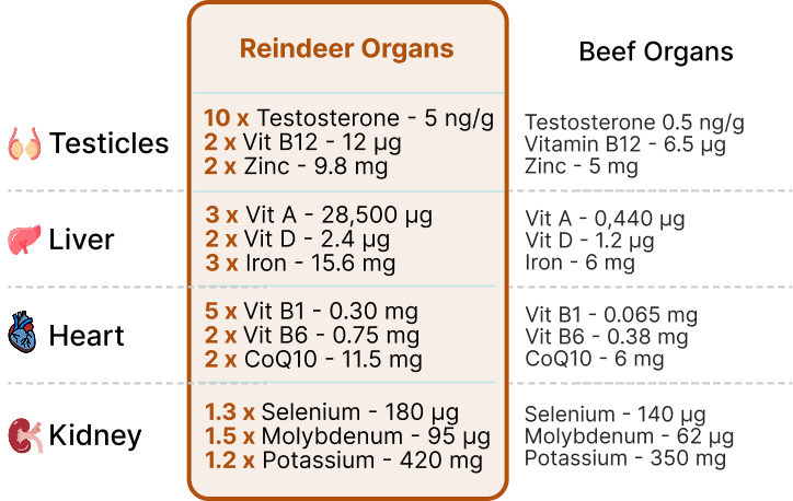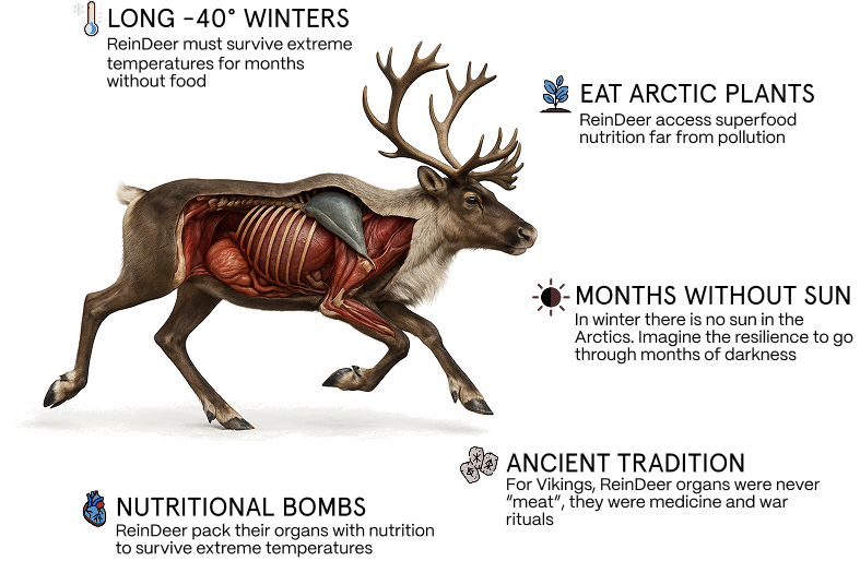 The human body is developed over 10,000 of years and is used to run on animal nutrition like organs. Reindeer Organs have unmatched bioavailability.