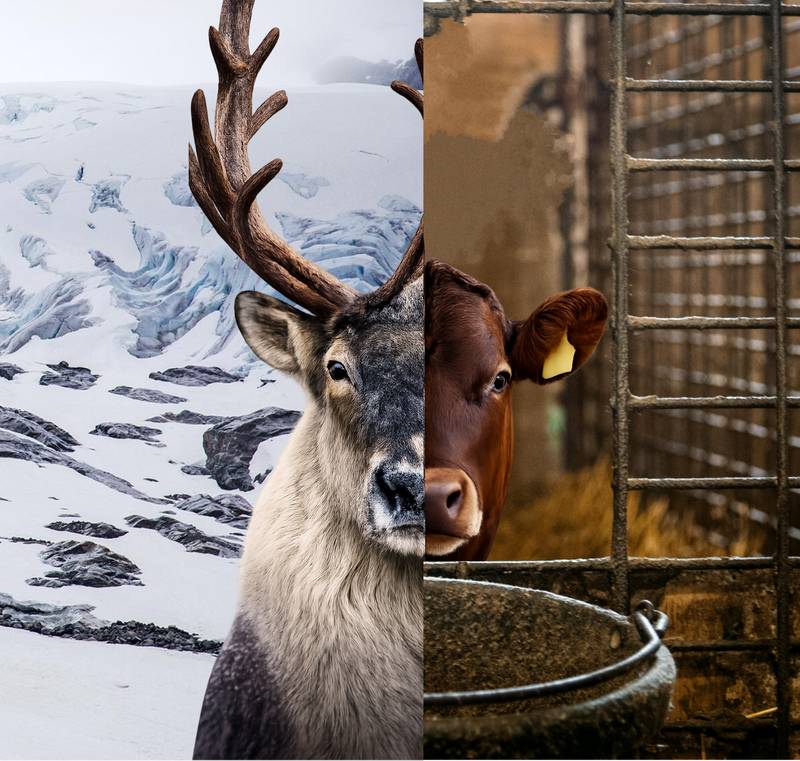 Reindeers explore untouched nature and need to survive and find food in the wild. Protect themselves from wolves and travel 5,000 km per season. More than ANY OTHER land mammal. Cattle is made to stand still and be fed without work. Reindeer organs contain more antioxidant enzymes and mitochondrial density, and better omega-3, stearic acid ratios andstronger collagen. Reindeer can sprint 50 mph.