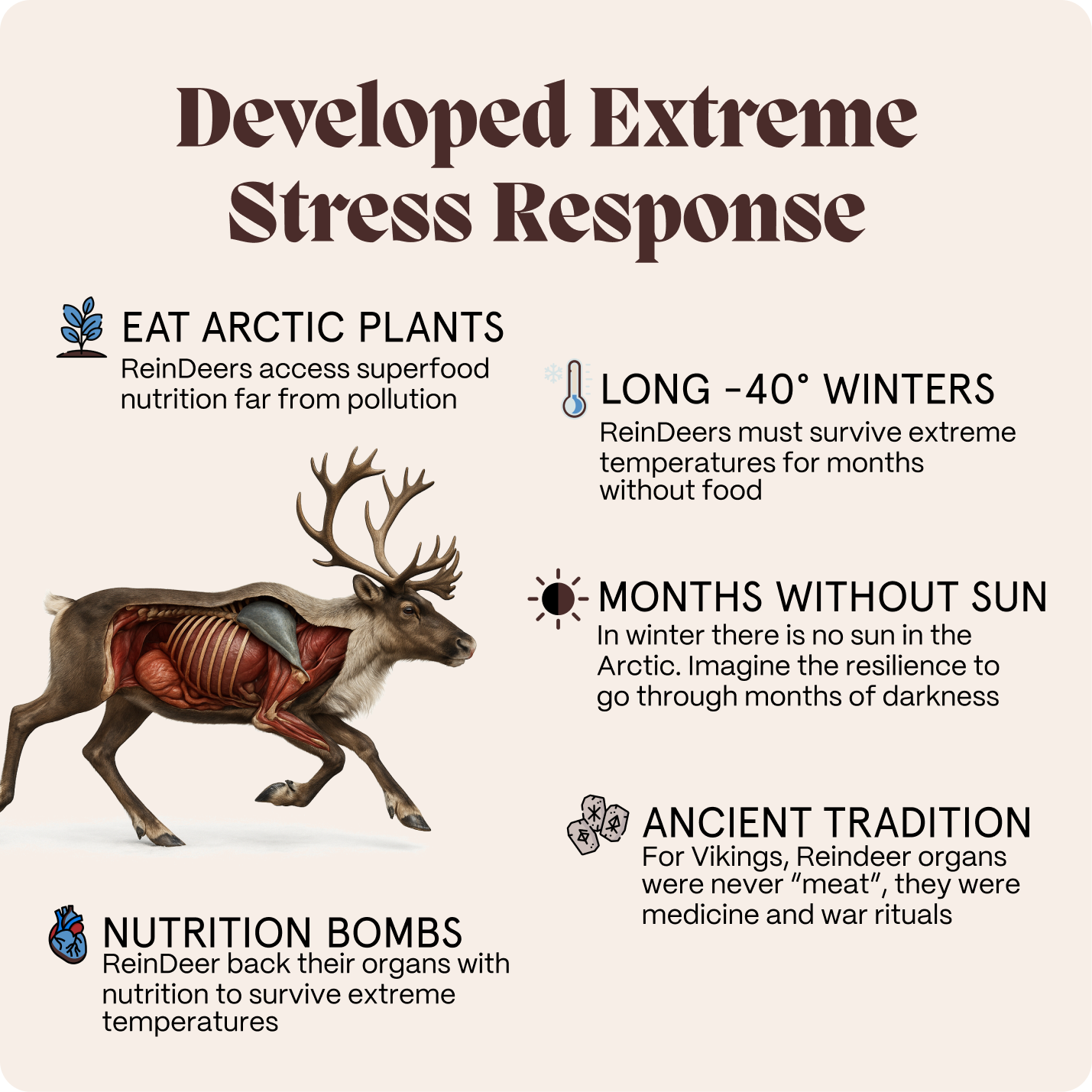 Reindeer Organs are later shown to lower cortisol and stress in a unique way. The Vikings knew this already thousand years ago, but the last decades big Pharma has been hiding it.