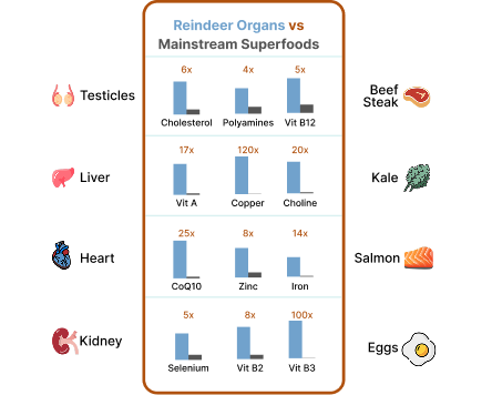One of the big draw backs of Beef Organs is the level of toxins. They are raised close to cities and pollution and are trapped in the same small area their whole life. Reindeers roam above the arctic circle far away from civilization and are free of heavy metals, micro-plastics and other toxins that will lower you Testosterone and performance.